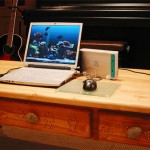 小石に穴を開け、引き出しの取っ手に・・・ 真鍮のリベットに飾りつけ(デザイン、打ち込みは子供が担当) オスモカラーを2度塗りして、自宅のノートパソコンのテーブルが完成です(^^)v