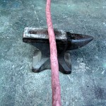 銅のぼうをあぶってなましています。 20mmの丸棒が手で曲がります。 ハンマーで叩いて、成形していきます。 表面を硫化イブシの処理をすると、濃淡がハッキリ浮き上がってきます。
