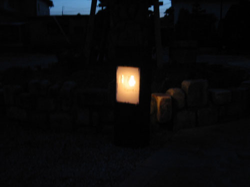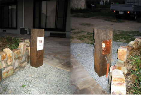 k邸外構工事 2002/5/25 土曜日2012/8/24 金曜日 by miyasu ガーデン&エクステリア 門柱にポストと表札を取り付け、花壇部分に植栽を行いました。 正面 花壇部分 ヒロノクラフトオリジナル銅製ポスト 彫刻した素焼きの鉢をプレゼントしました。 枕木をくりぬいて、はだか電球を金網とアクリル板でカバーしています。(防雨カバー付) 電気が付くと名前が浮き上がります。 お問い合せ用URL : お問い合せの際に上記URLをコピーして『お問い合せ内容』に貼り付けて頂ければ幸いです