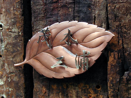 創作表札 2002/8/27 火曜日2012/10/2 火曜日 by miyasu 創作表札 ステンレス切り文字銅の葉 いぶし処理した銅を葉の形にたたき出し、ステンレスの切り文字(鏡面仕上げ)を重ねました。 お問い合せ用URL : お問い合せの際に上記URLをコピーして『お問い合せ内容』に貼り付けて頂ければ幸いです