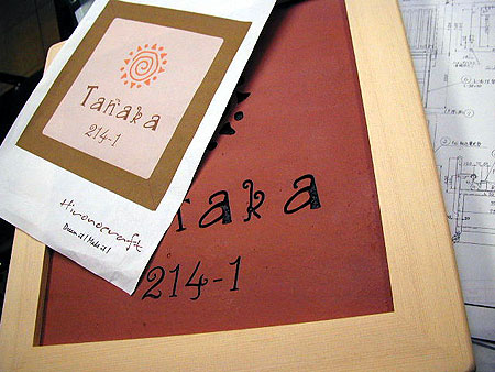 テラコッタとウッドフレーム 2002/9/1 日曜日2012/10/2 火曜日 by miyasu テラコッタ表札 ウッドフレームテラコッタタイル 南欧風の個性的な家に取り付けます。 何回か足を運んでイメージを作っていきました。テラコッタは現場で使用しているもの 漆喰と珊瑚の壁が待っています。 シルエットが個性的なお宅です。 このイメージから表札を製作しました。 本日、取り付けに行ってきました。 イメージしていた通りに仕上がりました(^_^)v アルミのインゴット風のライト ヒロノクラフトでサテン仕上げを施しました。 お問い合せ用URL : お問い合せの際に上記URLをコピーして『お問い合せ内容』に貼り付けて頂ければ幸いです