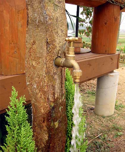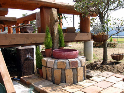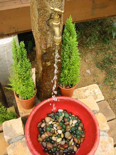 六方石の立水栓 2002/10/7 月曜日2012/8/23 木曜日 by miyasu ヒロノクラフト便り 六方石を加工して製作した立水栓のアレンジ 水に濡れた時の六方石の質感がイイですよ(^^)v 水鉢には、工業用のビー玉(ボールベアリング用)と中国の五色石を入れました。 工業用ビー玉は大きめで、いろいろ使っています。(サイズ25mm) まだ、ドラム缶に半分ほど残っているのでご希望の方は連絡ください。お安くお分けできると思い ます。(掲示板を見ていただける人限定) メールでお問い合せください。 透明度は低いのですが、深みのあるグリーンのガラス玉です。 お問い合せ用URL : お問い合せの際に上記URLをコピーして『お問い合せ内容』に貼り付けて頂ければ幸いです