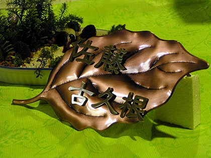 銅の葉 2002/12/25 水曜日2012/10/2 火曜日 by miyasu 銅・真鍮の表札 ステンレス切り文字銅の葉 柔らかいイメージで仕上げた銅の葉にステンレスの切り文字をボルトで固定します。 手作りのため時間がかかりますが、味わいのある表札です。 お問い合せ用URL : お問い合せの際に上記URLをコピーして『お問い合せ内容』に貼り付けて頂ければ幸いです