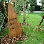 5年ほど前の作品 大木の端材を利用したガーデンサイン・・ 枕木の門柱のくり貫いた窓から見たアプローチ