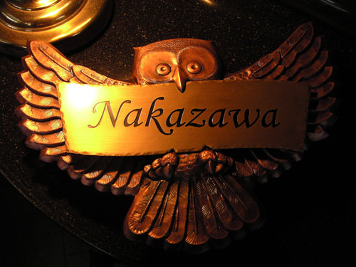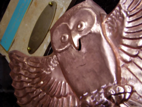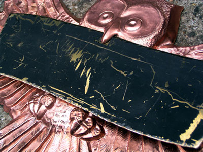 銅のフクロウ表札 2003/3/1 土曜日2012/10/1 月曜日 by miyasu 創作表札 製作中・・・ 出来上がりをお楽しみに・・・ これからネームの部分(真鍮)の製作に取り掛かります。 これから真鍮の部分に名前を刻みます。 出来上がりました(^^)! フクロウ(銅) ネーム(真鍮) size W320×H220 お問い合せ用URL : お問い合せの際に上記URLをコピーして『お問い合せ内容』に貼り付けて頂ければ幸いです