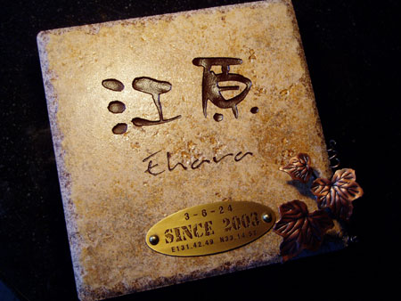 アンティークタイル表札 2003/3/22 土曜日2012/10/1 月曜日 by miyasu アンティークタイル表札【薄茶色】 アンティークタイルにオリジナル筆書体を彫刻して銅の飾りを付けました。 真鍮のプレートには番地、緯度、経度を彫刻しました。 お問い合せ用URL : お問い合せの際に上記URLをコピーして『お問い合せ内容』に貼り付けて頂ければ幸いです