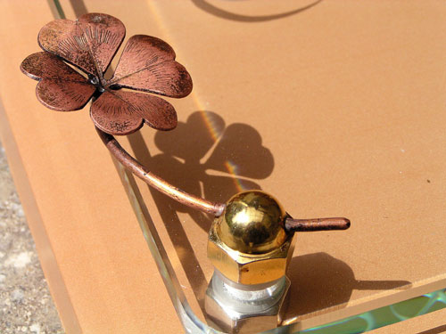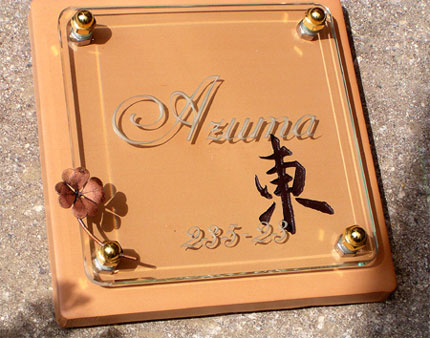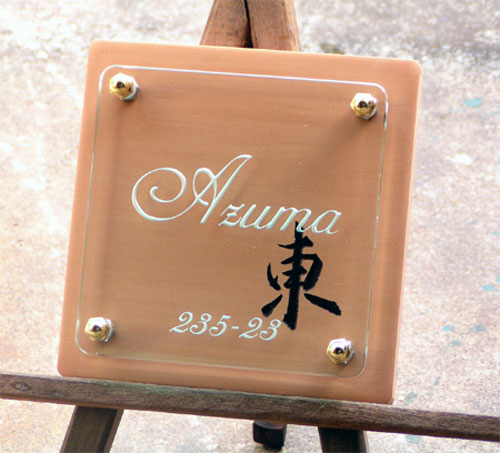 クリスタルガラス表札 2003/7/11 金曜日2012/9/20 木曜日 by miyasu クリスタルガラス表札 筆文字を彫刻したテラコッタに、ガラスの表札を重ねました。 筆文字は、お客様の直筆です。 化粧ナットに銅のクローバーを取り付けて完成です。 ハンダ付け お問い合せ用URL : お問い合せの際に上記URLをコピーして『お問い合せ内容』に貼り付けて頂ければ幸いです