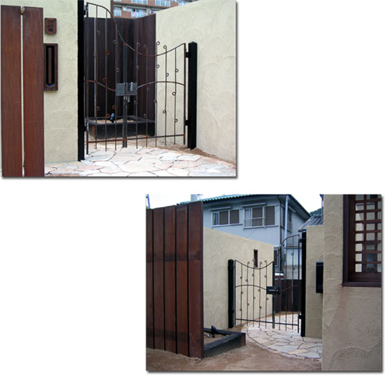 オリジナルフェンス&門扉 2003/8/15 金曜日2012/8/24 金曜日 by miyasu ガーデン&エクステリア オリジナルデザインのフェンス(2000×800)と門扉を製作中。 柔らかな曲線を繊細な異形丸で表現します。 門扉ももう少しで完成です W1450×H1700 調整のため仮止めです。イメージ通りに仕上がっています。 取って、兆番、支柱などの部分も手作りしました。 勝手口も同じデザインで・・・ お問い合せ用URL : お問い合せの際に上記URLをコピーして『お問い合せ内容』に貼り付けて頂ければ幸いです