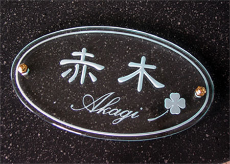 クリスタルガラス表札 2003/10/17 金曜日2012/10/1 月曜日 by miyasu クリスタルガラス表札 既製の門柱の表札部分にあわせて楕円にカットしたガラス表札です。 お問い合せ用URL : お問い合せの際に上記URLをコピーして『お問い合せ内容』に貼り付けて頂ければ幸いです
