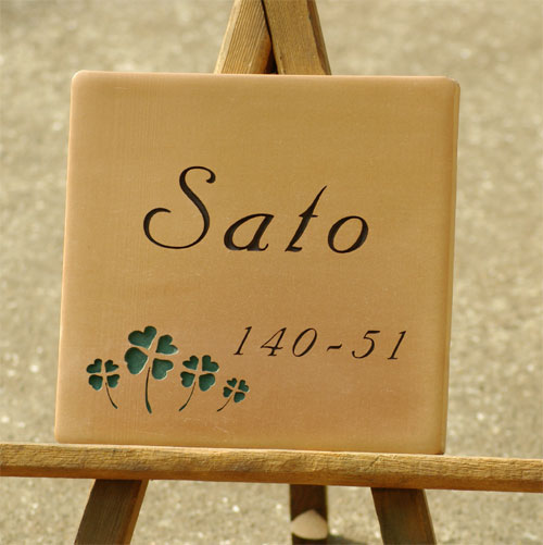 テラコッタ表札 2003/12/25 木曜日2012/8/22 水曜日 by miyasu テラコッタ表札 家族の数のクローバーをレイアウト お問い合せ用URL : お問い合せの際に上記URLをコピーして『お問い合せ内容』に貼り付けて頂ければ幸いです