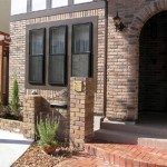 落ち着いた色のレンガの門柱にクリスタルガラス表札(テラコッタ)