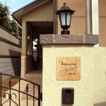 既製の門柱の表札取付部にカットしたアンティークタイルをはめ込みました。 既製門柱の表札製作は、出来るだけ一体感がでるように工夫しています。 違和感のないように・・・