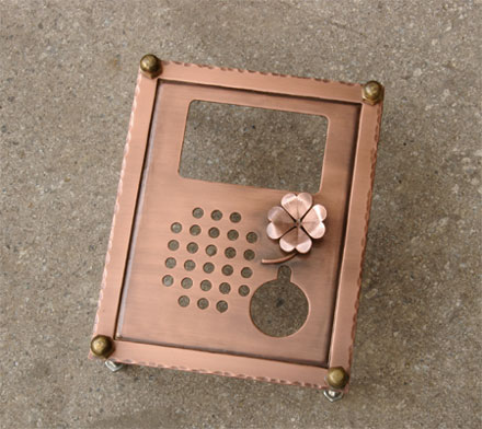 銅製インターホンカバー 2004/1/17 土曜日2012/9/19 水曜日 by miyasu 銅製インターホンカバー 手作りで仕上げる銅製のインターホンカバーです。受注生産品 (いぶし仕上げ→ウレタンコート) 現在の外構の中で既製のインターホンやポストの質感ではあまりにも違和感を感じます。 ヒロノクラフトでは自然の石やレンガ、草木と同じ流れの中で風化していく素材を選んで製作しています。 お問い合せ用URL : お問い合せの際に上記URLをコピーして『お問い合せ内容』に貼り付けて頂ければ幸いです
