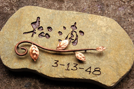 自然石表札 2004/10/8 金曜日2012/8/23 木曜日 by miyasu 自然石表札 自然石を門柱にあわせて時間をかけて製作しています。 プロバンスライムストーン イメージにカットして和書体でレイアウト、彫刻しました。 銅の飾りを取り付けて仕上がります。 味わいのある自然石のオンリーワンの表札です。 お問い合せ用URL : お問い合せの際に上記URLをコピーして『お問い合せ内容』に貼り付けて頂ければ幸いです