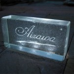 テラコッタのベースにLED(発光ダイオード)を組み込みました。 彫刻したガラスを重ね文字を浮き上がらせます。