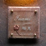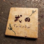 緑青色のアンティークタイルにゴールドの着色でお名前を刻みました。