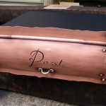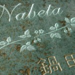 いぶし仕上げの銅に名前を刻み、淡いピンク色のタイルに重ねました。 銅のプレートは浮かせて固定するので、立体的に仕上がります。