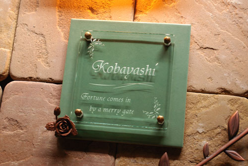 Free-Style表札 ガラス オーダーデサイン 2005/4/7 木曜日2012/10/2 火曜日 by miyasu フリースタイル表札 鮮やかなナチュラルグリーンのタイルにガラスを重ねました。 英語のことわざをレイアウト ”笑う門には、福来たる” 銅板を重ねて作った手作りのバラをアクセントに・・・ お問い合せ用URL : お問い合せの際に上記URLをコピーして『お問い合せ内容』に貼り付けて頂ければ幸いです