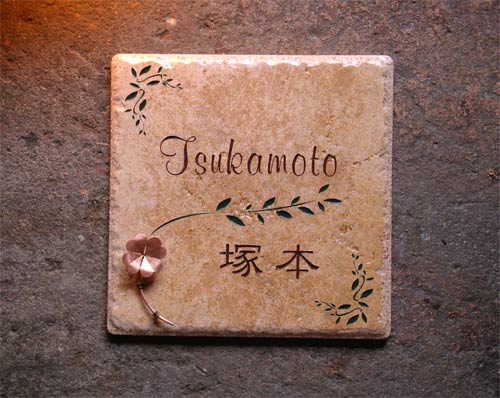 アンティークタイル表札 2005/5/9 月曜日2012/8/25 土曜日 by miyasu アンティークタイル表札【薄茶色】 可愛いフォントでレイアウトしました。 銅製クローバーを製作し取り付けて完成です。 手作りの銅製クローバーを取り付けました。 お問い合せ用URL : お問い合せの際に上記URLをコピーして『お問い合せ内容』に貼り付けて頂ければ幸いです