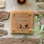 テラコッタタイルをベースに彫刻したガラスを浮かせて重ねます。< タイルにオリジナル和(なごみ)書体を彫刻して奥行きのある表札に仕上げました。