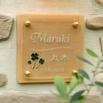 タイルにクローバーをアレンジ・・・ デザインの打ち合わせはお客様の好みや素材に合わせて納得がいくまで校正しています。 夜の表情・・・ガラスの側面にライトを当てると綺麗に文字が浮き上がります。