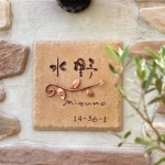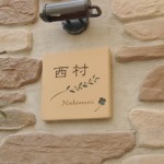 既製の門柱に取付けるためベースのテラコッタタイルをご希望のサイズ(14.8X14.8cm)にカットして製作しました。 エッジを立てて手作業で立体的な彫刻に仕上げます。文字の落とす影が表札を豊かな表情に・・・