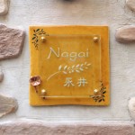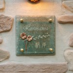 緑青のアンティークタイルに可愛いイメージで・・・ ガラスの表札はガラスの側面に光を当てると綺麗に文字が浮き上がります。