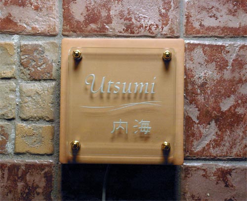 クリスタルガラス表札 LED仕様 2006/1/27 金曜日2012/8/22 水曜日 by miyasu クリスタルガラス表札【LED仕様】 テラコッタタイルをベースにシンプルにレイアウトしました。 LED(発光ダイオード)点灯・・・ LED仕様のクリスタルガラス表札はLED回路の製作が遅れています。 納期についてはご確認ください。 お問い合せ用URL : お問い合せの際に上記URLをコピーして『お問い合せ内容』に貼り付けて頂ければ幸いです