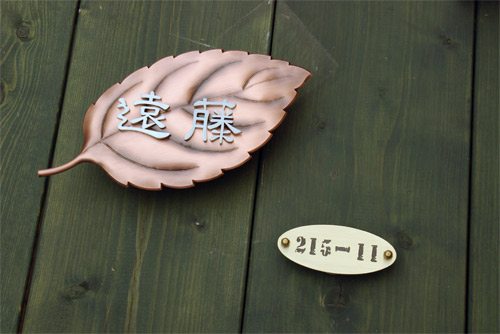 創作表札 真鍮番地プレート 2006/4/8 土曜日2012/10/2 火曜日 by miyasu 創作表札 ステンレス切り文字銅の葉 手作りの銅の葉にステンレスの切り文字を固定・・・ 立体的な表札です。 お問い合せ用URL : お問い合せの際に上記URLをコピーして『お問い合せ内容』に貼り付けて頂ければ幸いです