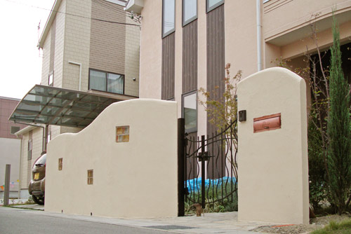 ヒロノクラフト外構工事 part2 2006/10/23 月曜日2012/8/24 金曜日 by miyasu ガーデン&エクステリア モルタルしごき塗りで全体を滑らかな仕上げに・・・ オレンジのガラスレンガから光が射し込みます。 表面をジョリパットでコテ仕上げ・・・門扉が入ると引き締まります。 ポストはヒロノクラフトオリジナル銅製ポスト・表札。 表札を付けました。 植栽を入れアコーディオン車庫門扉を取付けました。 オリジナルで製作したカーポート用ルーバーを設置して完工です。 お問い合せ用URL : お問い合せの際に上記URLをコピーして『お問い合せ内容』に貼り付けて頂ければ幸いです
