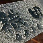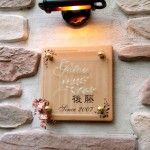 無垢のガラスの塊に立体的に文字を彫刻しています。 照明を当てるとガラスの中の気泡が星屑のように輝きます。