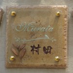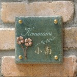 ガラスとベースタイルに彫刻して立体的な表札に仕上げました。 手作りの銅のアイビーを取り付けました 夜の表情はまた違う表情で楽しめます。 静岡県に送ります。