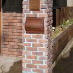 事務所前にブリックタイルの門柱を製作しました。 昔からあったブロックの柱を下地処理・・・ 銅製ポスト、Free-Style表札(HAS)を固定 目地はブルーの色粉で着色 乾いてくるとイメージ通りのパステルブルーに