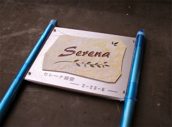 マンション用館名板 2007/2/16 金曜日2012/10/2 火曜日 by miyasu オーダーサイン オリーブマンション用 異素材(ステンレス&自然石)を組み合わせて館名板を製作しました。 工程が多く時間がかかりましたが、イメージ通り仕上がりました。 ステンレスに自然石(パラストーン)を嵌め込んで、一体感のある館名板に仕上げました。 金属部から自然石が浮き上がってくるようなイメージで・・・ お問い合せ用URL : お問い合せの際に上記URLをコピーして『お問い合せ内容』に貼り付けて頂ければ幸いです