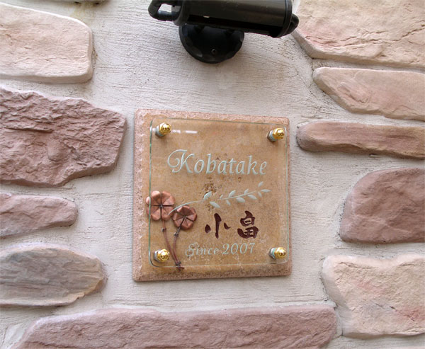 今回は色々とありがとうございました。 待ちに待った表札です。予想以上に可愛くて家のイメージにピッタリです。 表札は色々と悩みましたが、ありきたりではなく、また自然で、家に馴染むような物を探していたので、ヒロノさんのHPを見たときは「これだっ!」と主人と共に一目惚れ状態でした。主人はガラス、私はタイルと銅が使いたかったので、これで夫婦共に大満足です♪しかもこんなに可愛いデザインですし! 一生大事に使わせて頂きます。 本当にありがとうございました。 返信