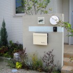ホワイトを基調にした門柱にフレーバータイル(ホワイト)のFree-Style表札 ガラスは新しい手作りのあじわいあるNEWガラスです。