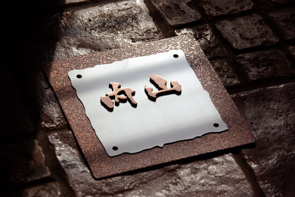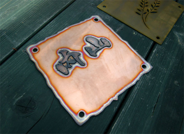 厚みの違う銅をカットして、文字はステンレスに接着し研磨した銅板を重ねます。