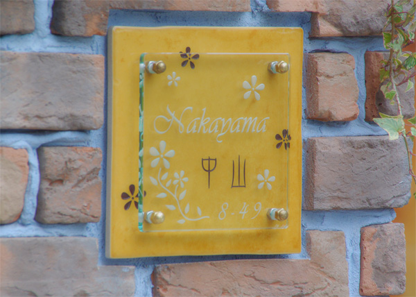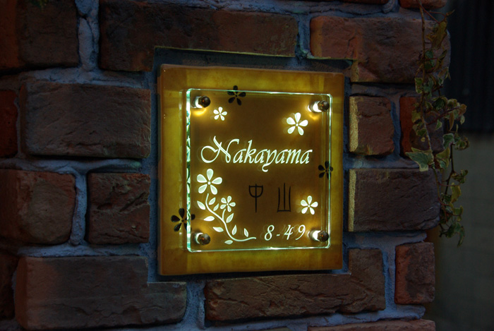 Free-Style表札 LED仕様 2008/3/13 木曜日2012/8/21 火曜日 by miyasu ガラス表札【LED仕様】《AC電源》 アプリコットのフレーバータイルに花を彫刻したガラスを重ねています。 タイルにもバランスよく彫刻して・・・ 夜の表情はLEDで立体彫刻の文字が浮き上がります。 市内に送ります。 お問い合せ用URL : お問い合せの際に上記URLをコピーして『お問い合せ内容』に貼り付けて頂ければ幸いです
