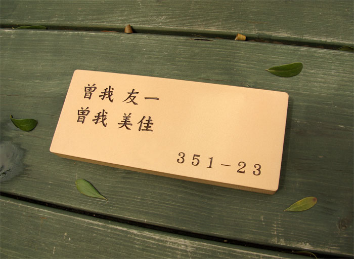 テラコッタ表札 オーダーサイズ 2008/5/29 木曜日2012/8/22 水曜日 by miyasu テラコッタ表札 ご希望の大きさでカットして製作しました。(197X82) テラコッタ表札はミリ単位で加工可能です。 細いラインもエッジを立てて丁寧に彫刻、着色しています。 高知県に送ります。 施工写真 お問い合せ用URL : お問い合せの際に上記URLをコピーして『お問い合せ内容』に貼り付けて頂ければ幸いです