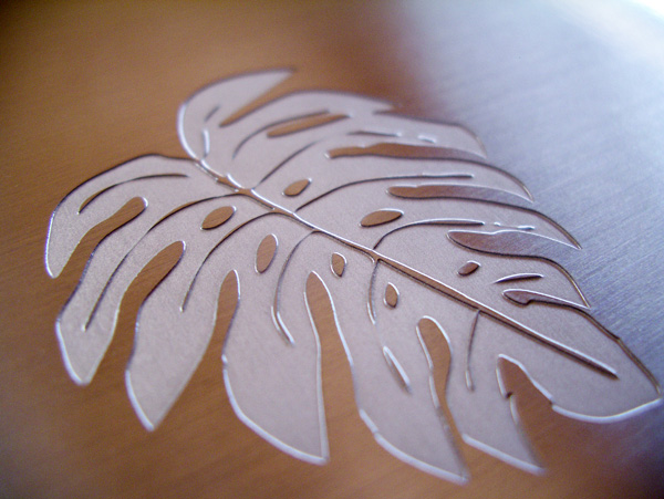 大きな葉に深い切れ込みのモンステラはベースのステンレスに彫刻しました。