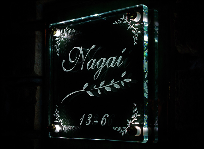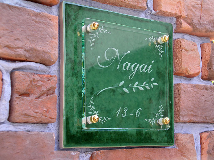 Free-Style表札 LED仕様 ソーラー電源 2008/10/9 木曜日2012/8/21 火曜日 by miyasu ガラス表札【LED仕様】《ソーラー電源》 ディープグリーンのフレーバータイルに彫刻したガラスを重ねました。 夜になると自動でLEDが点灯して立体彫刻を浮き上がらせます。 横浜に送ります。 お問い合せ用URL : お問い合せの際に上記URLをコピーして『お問い合せ内容』に貼り付けて頂ければ幸いです