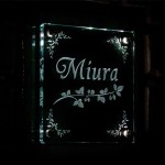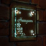 レンガサイズの無垢のガラスに裏面から深く彫刻しています。 素材感が我が家のシンボルに・・・ 夜は専用LED照明で文字が浮き上がります。 茨城県に送ります。