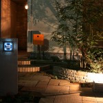 自然素材をふんだんに使ったガーデン 青いタイルのLEDの表札がアクセントになっています。