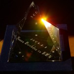 ピラミッド型のクリスタルにメモリアルを彫刻しました。 底辺80X80mm 文字は底面に裏彫りです。 撮影した夕陽の写真に光のプリズムが偶然当たって・・・ ピラミッド☆パワー