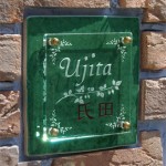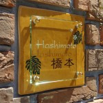 フレーバータイル(スカーレット)をベースにご希望のイメージを カタチにしました。 春になって蝶が表札に舞い下りました。 ガラスは味わいのある手作りのオリジナルYURAGIガラス・・・ 西宮に送ります。