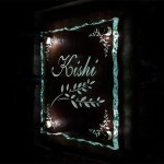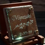 青いアンティークタイルに和書体で漢字を彫刻しました。 夜はLEDが灯って違う表情の表札に変身します。 福井県に送ります。