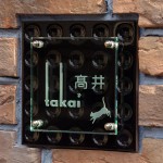 Free-Style表札 ディンプルタイル(黒) 2010/2/18 木曜日 モダンなブラックのディンプルタイルに側面を五面体に研磨した リジナルガラスを重ねました。 個性的なフォントに猫のシルエット、足跡のワンポイントをレイアウトしました。 岐阜県に送ります。