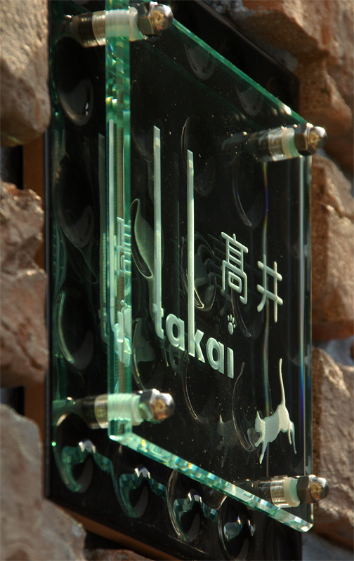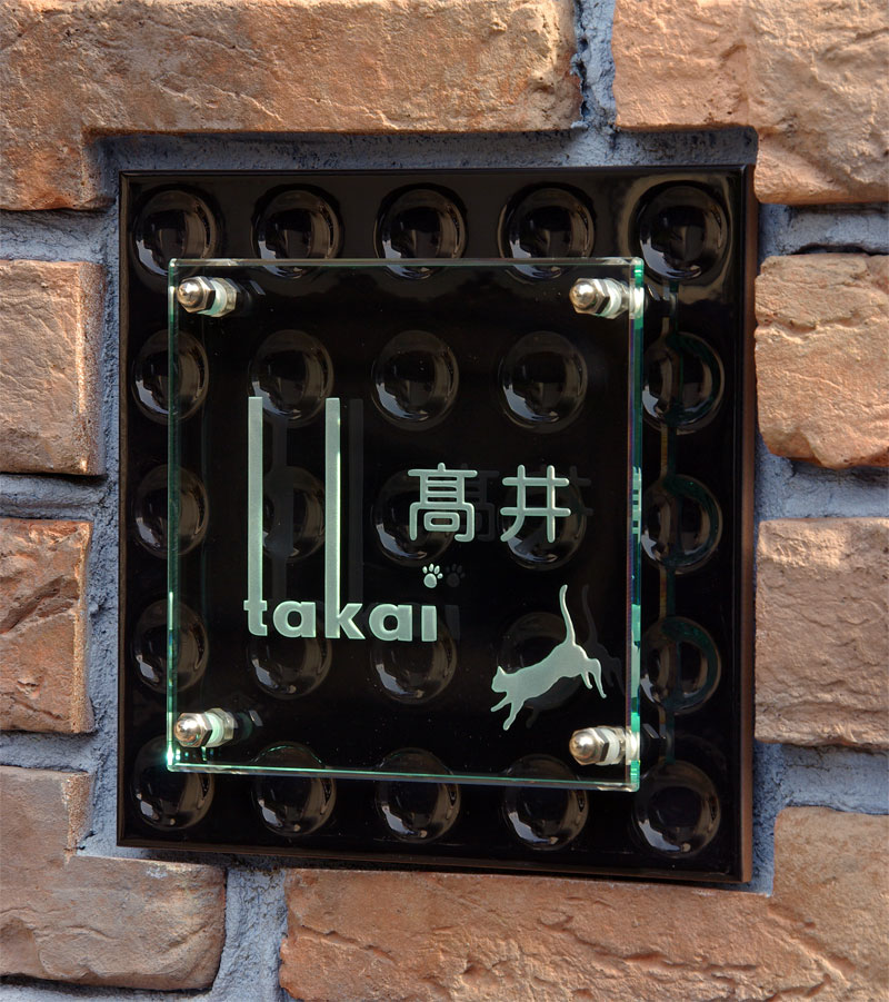Free-Style表札 ディンプルタイル(黒) 2010/2/18 木曜日2012/8/22 水曜日 by miyasu フリースタイル表札 モダンなブラックのディンプルタイルに側面を五面体に研磨した リジナルガラスを重ねました。 個性的なフォントに猫のシルエット、足跡のワンポイントをレイアウトしました。 岐阜県に送ります。 お問い合せ用URL : お問い合せの際に上記URLをコピーして『お問い合せ内容』に貼り付けて頂ければ幸いです