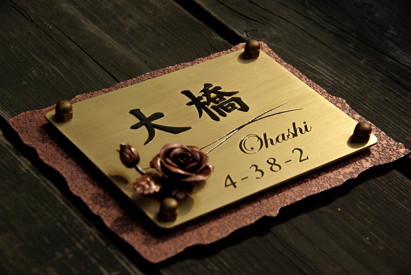 銅真鍮表札 銅のバラ 2010/6/17 木曜日2012/8/28 火曜日 by miyasu 銅・真鍮の表札 いぶし真鍮の切り文字をはめ込んで立体的な表札に仕上げました。 着色ではないいぶしの濃淡で表現しています。 銅製のバラを取り付けて完成です。 東京に送ります。 お問い合せ用URL : お問い合せの際に上記URLをコピーして『お問い合せ内容』に貼り付けて頂ければ幸いです