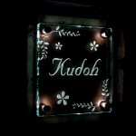アンティークタイル(白)を18X18cmにカットしてベースにしました。 昼間と夜の表情がまったく違う隠し絵のような表札です。 暗くなるとLEDが自動点灯。 東京に送ります。